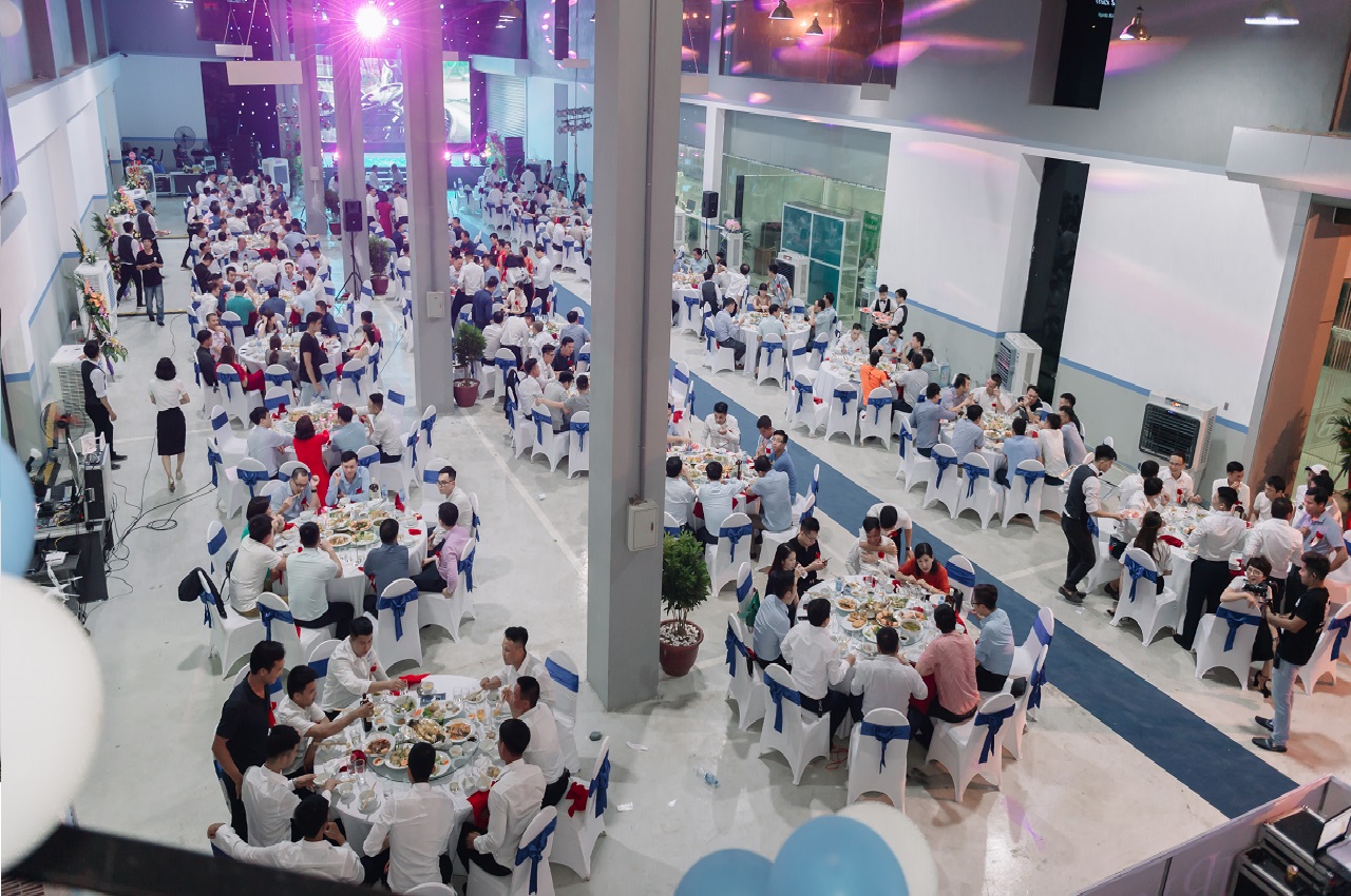 Toàn bộ nhân viên và khách hàng của Đại lý đang vui vẻ sử dụng tiệc trong chương trình