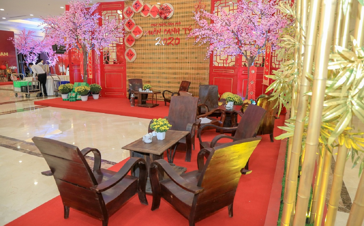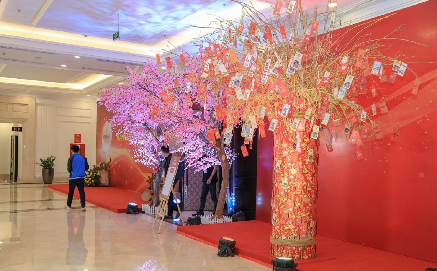 Khách mời đến với sự kiện được dẫn qua cửa tạo bởi hai cây đào uốn cong và Cây lì xì mang đến món quà xuân may mắn cho tất cả khách mời tham dự chương trình.